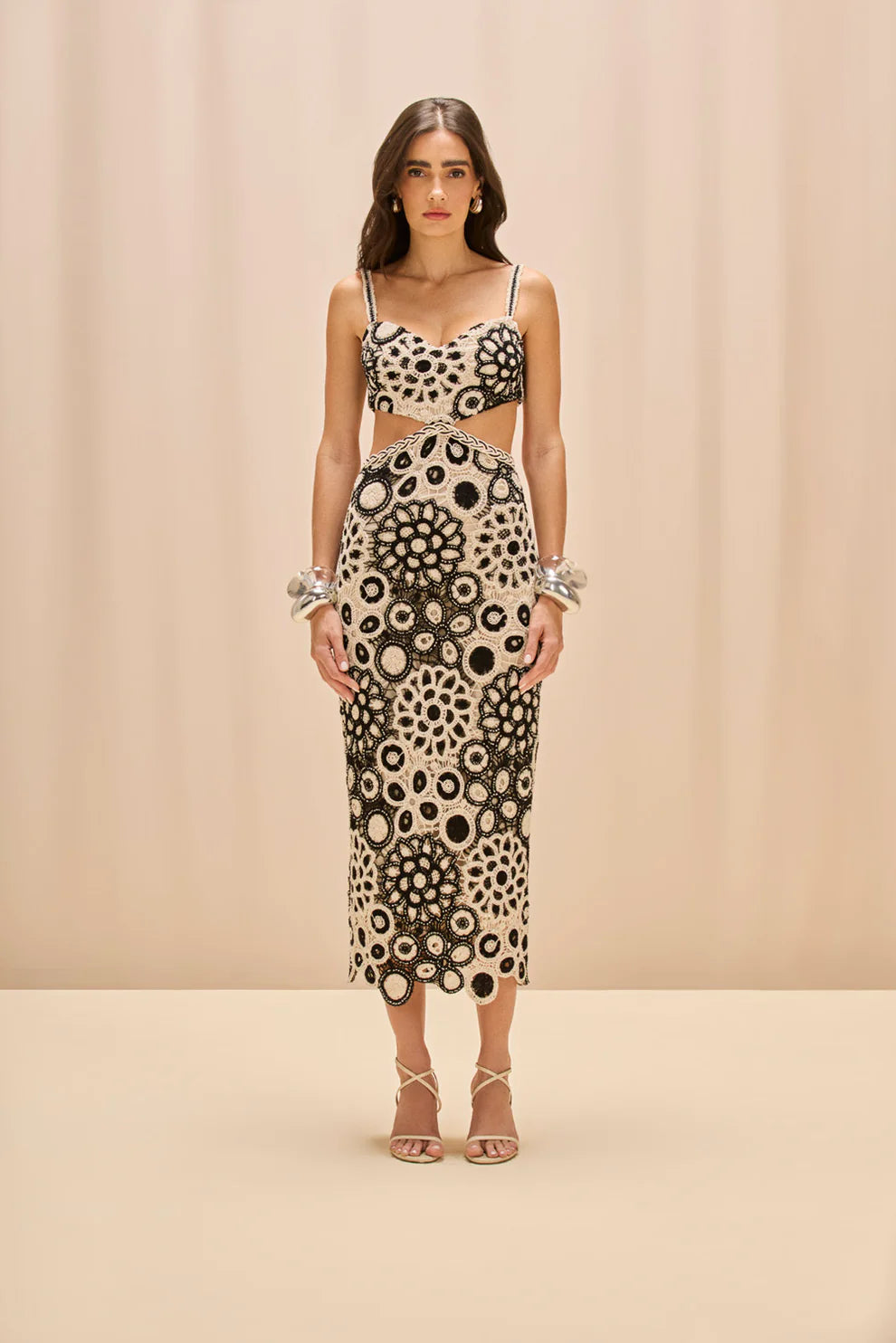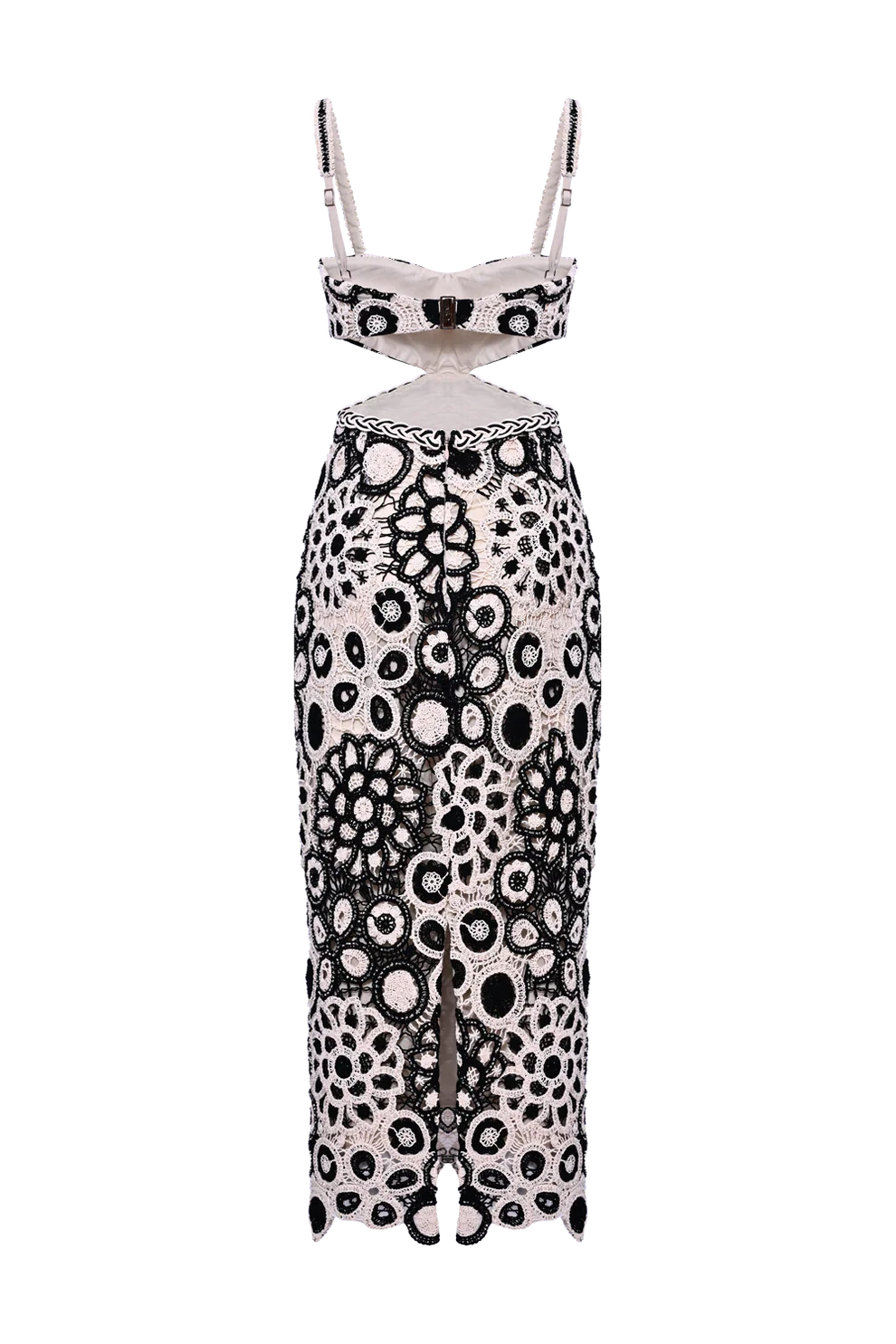 Embrace understated sophistication with this coral crochet midi dress, where meticulous craftsmanship meets contemporary design. Adjustable straps feature delicate hand-embroidered accents, while the sweetheart neckline flatters effortlessly. A strategically placed waist cutout, trimmed with intricate braiding, adds visual intrigue without compromising elegance. The hook-and-eye closure and concealed back zipper ensure a seamless silhouette. Perfect for warm-weather occasions, this piece balances artisanal detailing with the relaxed ease of crochet texture—a versatile investment for refined, casual styling.