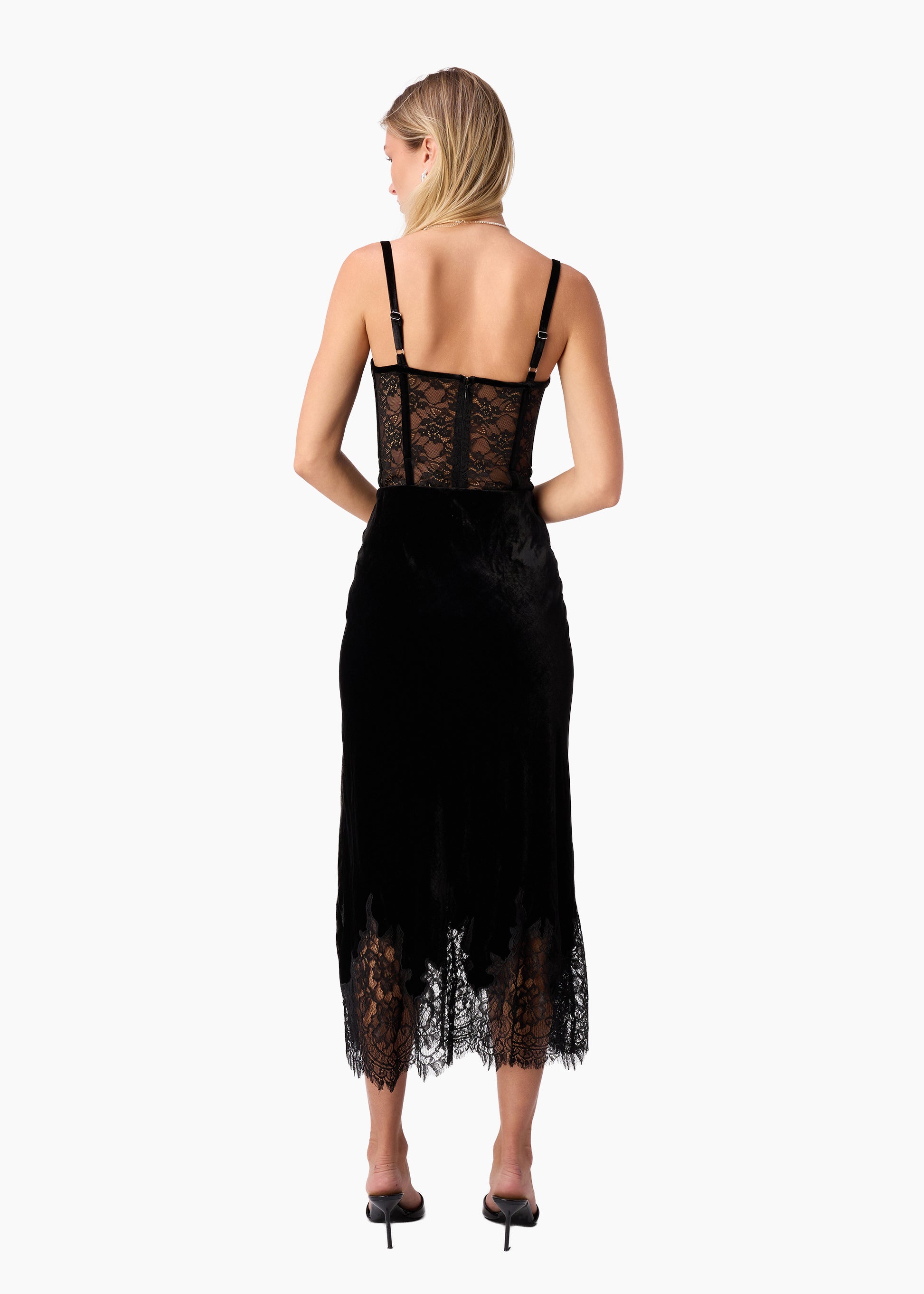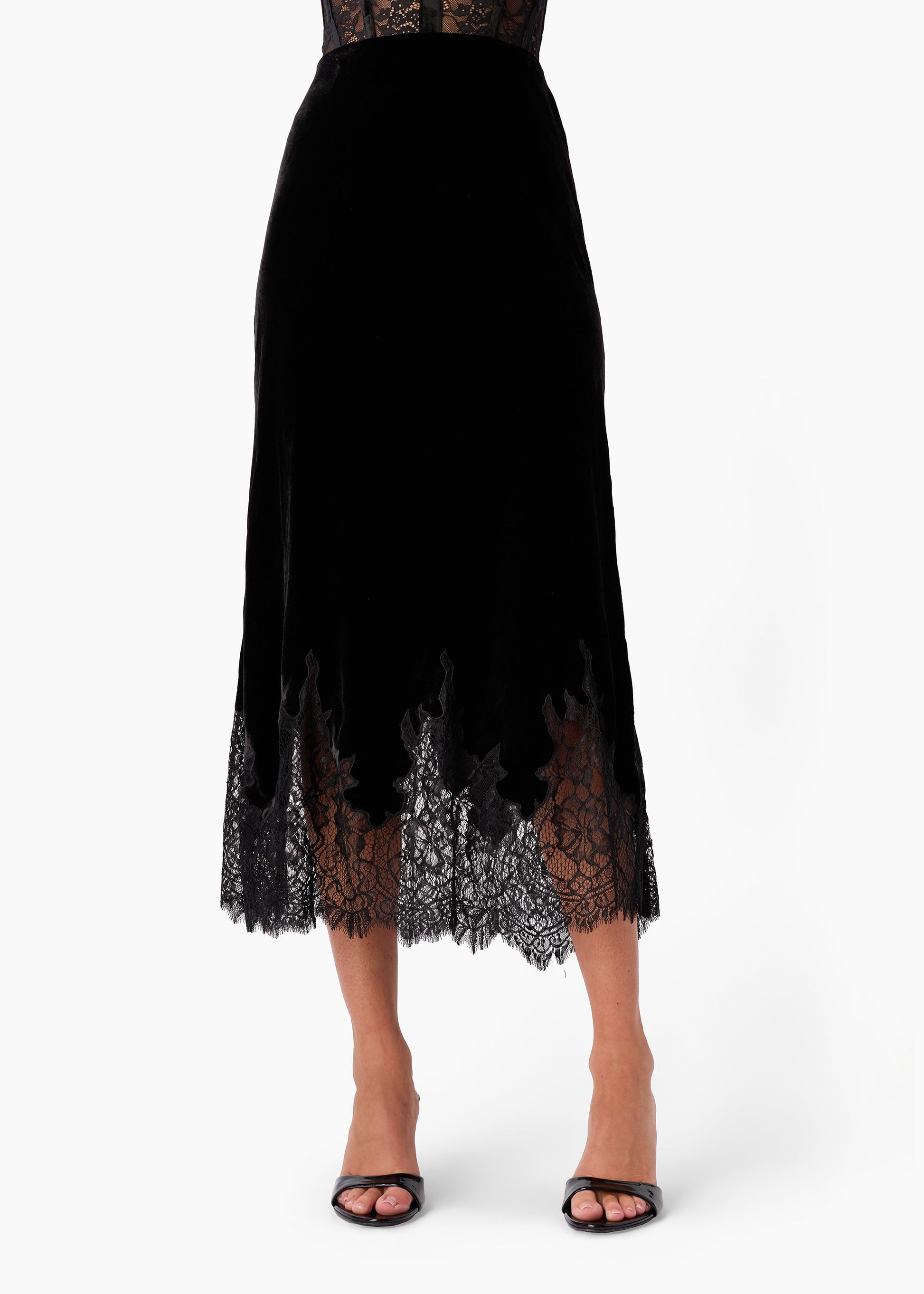 Crafted from a luxurious blend of 82% viscose and 18% silk velvet paired with delicate 100% nylon lace, the Georgiana Velvet Skirt offers an elegant silhouette with a refined texture. This sophisticated piece balances the softness and sheen of velvet with the subtle intricacy of lace, making it ideal for polished, expert styling in both formal and upscale casual settings.