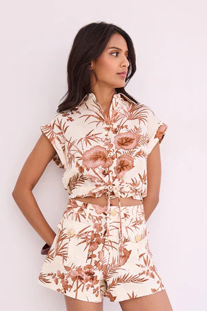The Octavia Top features a relaxed dropped shoulder silhouette with a classic collared neckline and functional center front placket. Self-covered buttons with gold eyelets add refined detail, while adjustable ties at the waist create a flattering cinched look. The back waist includes elastic for customizable fit. Decorative gold cord ends on the ties elevate the design, and the double rolled cuff at each sleeve opening provides a polished finish. Unlined construction keeps it lightweight and breathable, perfect for layering or wearing solo. An allover print completes this versatile piece.