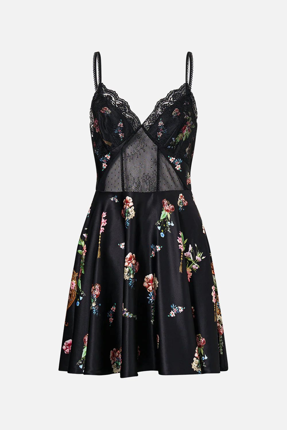 Crafted from luxurious 100% silk charmeuse, this Spliced Lace Mini Dress offers a refined silhouette with delicate lace detailing. Its smooth, lustrous fabric drapes elegantly, ensuring both comfort and sophistication for any upscale occasion. Perfect for those seeking timeless elegance with a modern edge.
